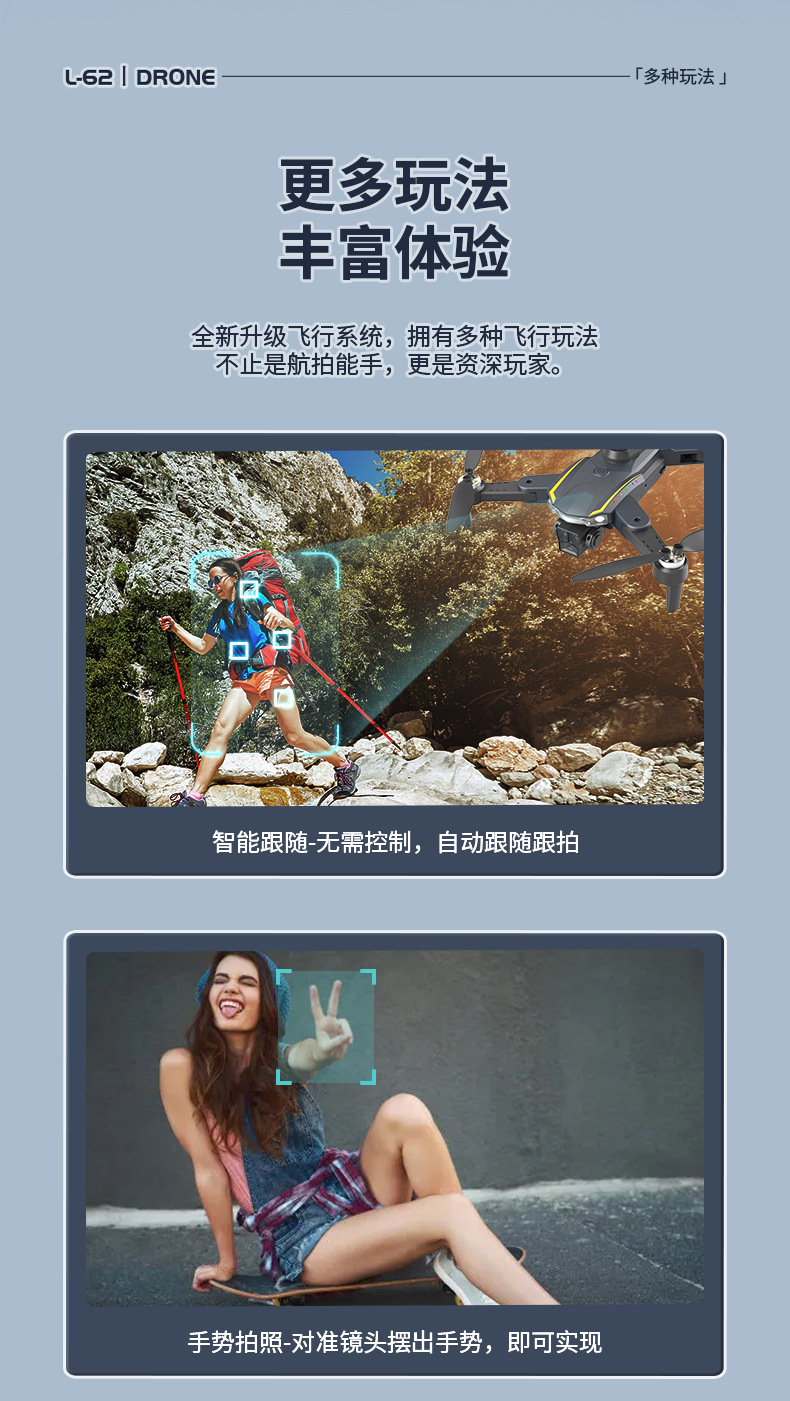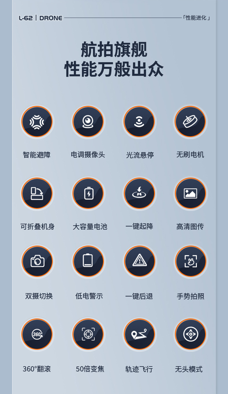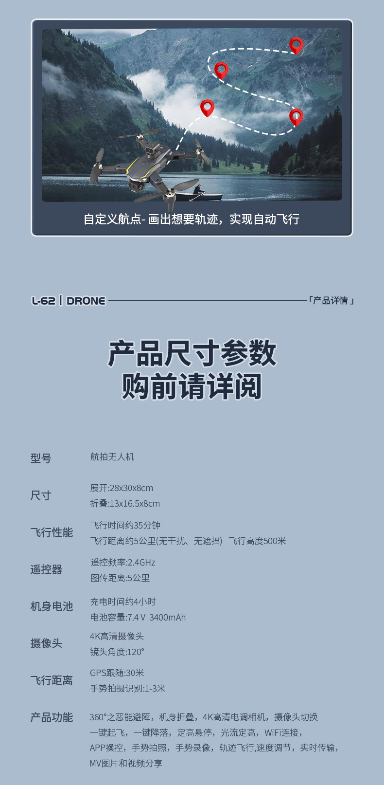| 颜色 | L62 光流定位 深灰色,L62 光流定位 防碳纤维 | 起飞全重 | 0-250g(不含) |